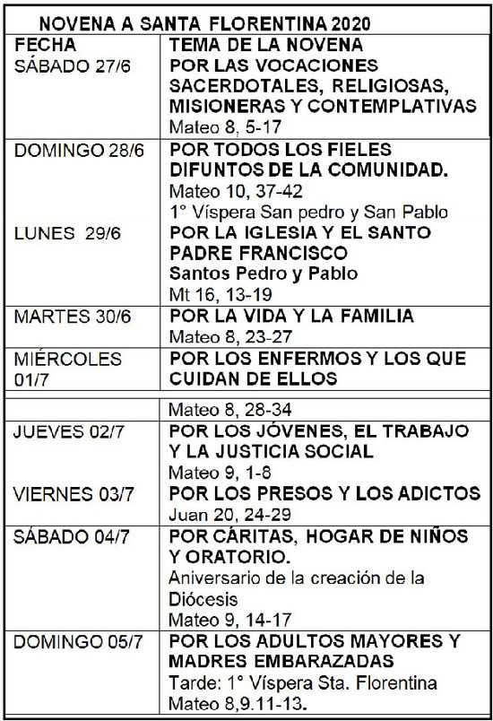 El sábado 27 de junio se iniciaran con la "Novena a Santa Florentina" en principio media hora antes de las misas transmitidas por Facebook, es decir 18:30 hs.