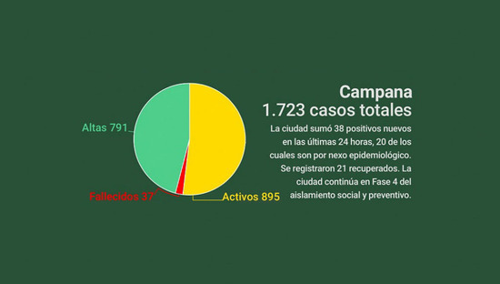 Además de los 38 positivos, ayer se comunicaron también 21 nuevas altas médicas y no se notificaron nuevas muertes, por lo que el cuadro de situación de Campana presentaba este viernes 895 casos activos; 791 recuperados; y 37 fallecidos.