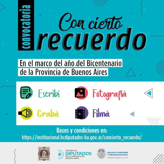 Esta convocatoria artística virtual "Con cierto Recuerdo" está impulsada por la Cámara de Diputados de la Provincia de Buenos Aires, la Facultad de Periodismo y Comunicación Social de la Universidad Nacional de La Plata y la Sociedad de Escritores de la Provincia