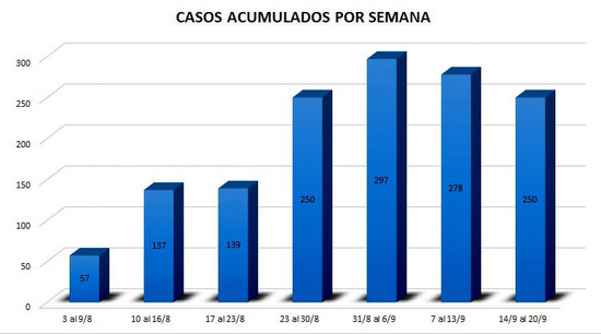 En cuanto a la evolución de los contagios, la última semana acumuló 250 casos, la misma cantidad que la del 23 de agosto. Un valor inferior al registrado en las últimas dos semanas que transcurrieron entre ambas: se totalizaron 297 en la que comenzó el 31 de agosto; y 278 en la que inició el 7 de septiembre (ver gráfico).