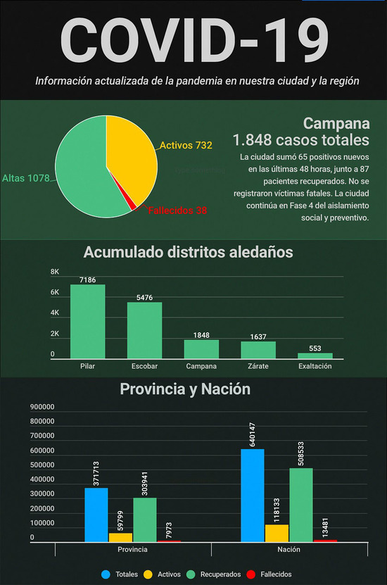 Por su parte, la Municipalidad de Escobar informó 219 nuevos contagios, 133 altas médicas y 5 decesos (tres mujeres de 65, 64 y 82 años; y dos hombres de 71 y 75) en las últimas 48 horas. De esta manera, acumula 5.476 casos totales: 2.441 se encuentran activos, 2.903 se han recuperado y 132 han fallecido.