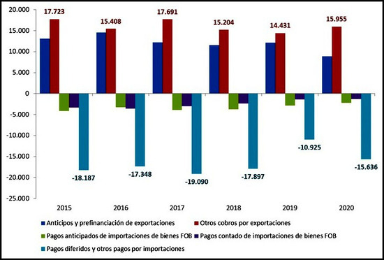 Continuemos: un pasito para el frente y un pasito para atrás. El BCRA profundizó el control para la compra de divisas en concepto de importaciones: se verificará el estado de "salida" de dichos bienes a través del Sistema Integral de Monitoreo de Importaciones (SIMI) y ampliará el régimen informativo de "Anticipo de operaciones cambiarias" cuando las mismas impliquen acceder a un monto diario superior a los USD 50.000, lo cual implica una reducción a la décima parte del nivel que regía hasta ahora. Recordemos que los pagos diferidos por importaciones fueron una fuente principal de demanda de divisas este 2020 pese a la aguda recesión interna.