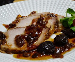 Poner al horno a temperatura fuerte unos 20 minutos. A esta altura de la cocción cubrir la superficie del carré con las fetas de panceta, seguir cocinando unos 5 minutos más y agregar la salsa de ciruelas en forma de lluvia.