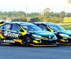 LOS RENAULT DE MILLA Y ARDUSSO A LA PAR, EN EL ATARDECER DE AYER EN EL AUTÓDROMO PORTEÑO.