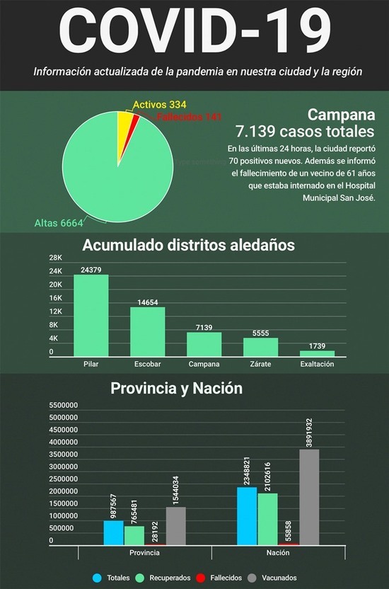A su vez, la Secretaría de Salud municipal confirmó ayer un nuevo deceso por segundo día consecutivo. En esta oportunidad corresponde a un hombre de 61 años que se encontraba internado en el Hospital San José. Con esta nueva víctima fatal, Campana acumula ahora 141 fallecidos en esta pandemia.