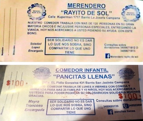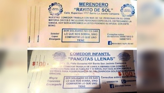 "Vinieron a mi casa y simulé que les iba a entregar dinero para poder sacarle fotos a los bonos, pero luego, cuando les dije que no podía colaborar con efectivo pero sí con comida, me pidieron que les devolvieran los bonos porque no aceptaban comida, sólo dinero. En Zárate trabajan igual. Acá son como 6 los que venden y van cuadra por cuadra de a dos, uno de cada vereda… Llamé a la policía, pero cuando llegaron ya se habían ido", concluyó la denunciante quien aportó copia del expediente iniciado por el Dr. Matías Ferreirós, diferentes imágenes de los bonos, y capturas de pantalla de discusiones a cuento de la problemática que tuvieron lugar días atrás en el Facebook de un merendero.
