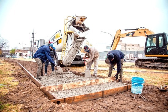 El intendente Abella supervisó la colocación del hormigón sobre el sendero que atraviesa la Plaza de las Carretas. El circuito, que se ejecuta con el apoyo de la empresa Tenaris, recorrerá desde Luis Costa hasta Colón y busca integrar al tejido urbano dos espacios emblemáticos de la ciudad.