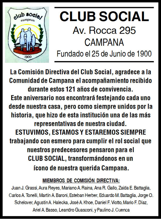Hoy, esta Comisión Directiva integrada por, Juan J. Grassi, Aura Reyes, Mariano A. Raina, Ana R. Gallo, Zaida E. Battaglia, Carlos A. Tonelli, Martín A. Baroni, Esteban Herber, Eduardo M. Battaglia, Jorge O. Schelover, Agustín A. Halecka, Jose A. Khoe, Daniel F. Viotto, Mario F. Diaz, Ariel A. Basso, Leandro Guasconi, y Paulino J. Cuenca, quien les escribe, seguiremos trabajando a la par, por esos ideales y pilares por los que se unió esa comisión fundadora del 25 de Junio del 1900.