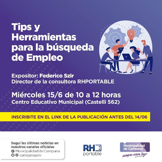 La actividad, que estará a cargo de la Oficina Municipal de Empleo, tendrá lugar este miércoles 15, de 10 a 12, en el Centro Educativo Municipal (CEM), ubicado en Castelli 562 y estará a cargo del Licenciado Federico Szir, Director de la consultora RHPORTABLE.