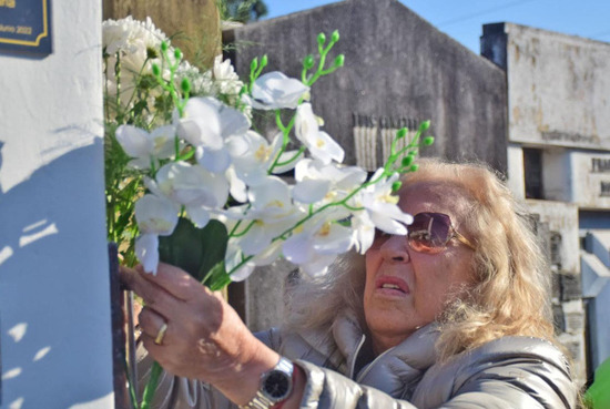 STELLA GIROLDI DEPOSITANDO UNA OFRENDA FLORAL EN LA TUMBA DE JORGE VARELA. LA EX INTENDENTE DE CAMPANA ESTUVO RODEADA DE SU FAMILIA.