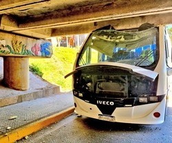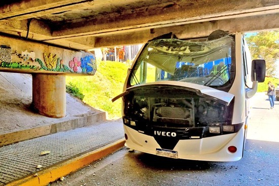 Un minibús de la empresa zarateña Claudio Bus quedó atascado ayer al mediodía debajo del viaducto que se encuentra en el barrio San Felipe y pasa por debajo de la Ruta 6.