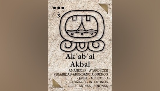 Ak´ab´al- akbal- noche polaridad- amanecer -atardecer-lo que esta oculto. Noche, soñar abundancia, el pulsar de las emociones internas, sacar las trabas que están en el inconsciente y no dejan avanzar. Purificar procesos. Deidad del cielo conquista- crecimiento al maximo posible- el cielo es el límite