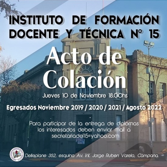 Como es de público conocimiento, debido a la pandemia, los años anteriores no se pudieron hacer los actos correspondientes, por lo que las autoridades del Instituto 15 decidieron agasajar a los egresados de los últimos tres años en conjunto. La Secretaría de la institución ya formalizó vía mail las invitaciones a todos los que recibirán sus merecidos diplomas, por lo que solicitan su confirmación, a los que aún no lo hicieron, al mail secretariadel15@yahoo.com