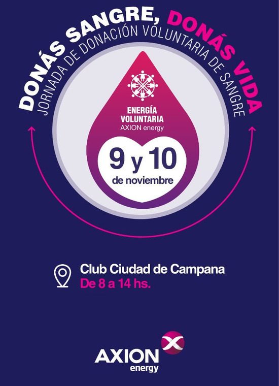 Hoy y mañana entre las 8 y 14 horas tiene lugar en las instalaciones del Club Ciudad de Campana una nueva Campaña de Donación Voluntaria de Sangre impulsada por Axion Energy.