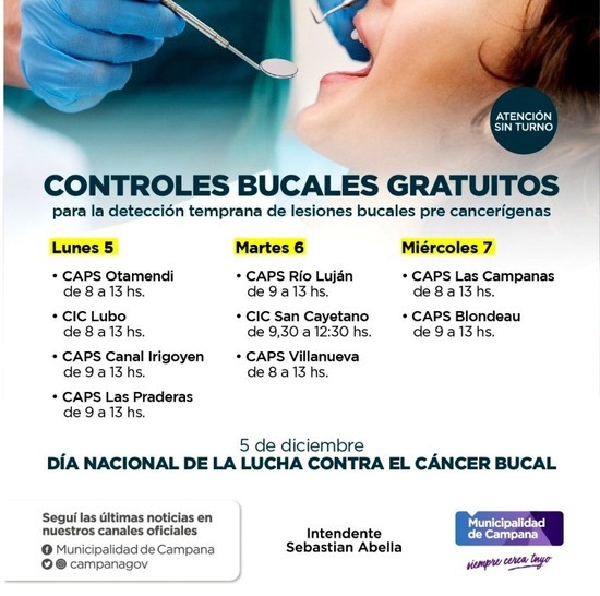 Con motivo de conmemorarse el 5 de diciembre el Día Nacional de la Lucha Contra el Cáncer Bucal, la Secretaría de Salud del Municipio – a través de la Dirección de Salud Comunitaria- llevará adelante una campaña de concientización y prevención a través de controles gratuitos en los Centros de Atención Primaria de la Salud (CAPS) y Centros Integradores Comunitarios (CIC) de la ciudad.
