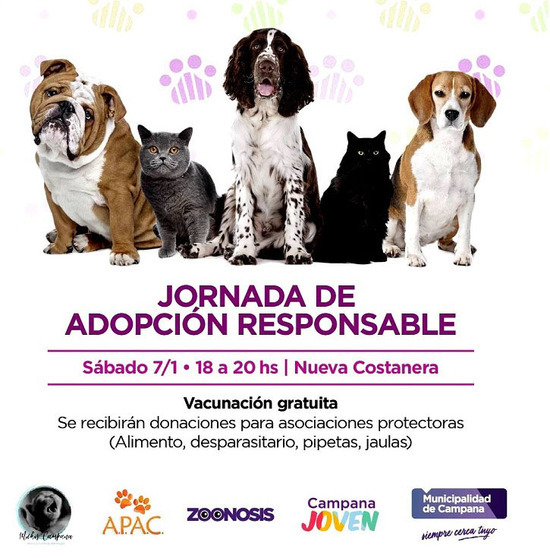 La actividad se llevará adelante de 18 a 20 con el objetivo de encontrarles familia a perros y gatos y es organizada por el Municipio con la participación de voluntarios del programa "Club de Jóvenes" y las organizaciones protectoras de animales APAC y Michis Campana.