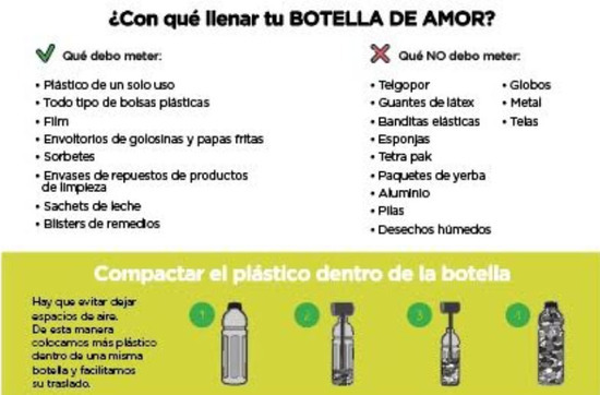 Se trata de botellas de plástico PET de gaseosa, agua mineral, entre otras, de cualquier tamaño, que una vez utilizadas y vacías, se rellenan con distintos plásticos de un solo uso (paquetes de galletitas, envoltorio de fideos, etc), comprimiéndolo bien hasta dejarla compacta.
