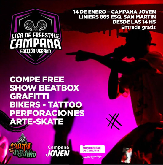 Este sábado 14 de enero se realizará el 1º encuentro de la Liga de Freestyle Campana, edición verano, de 14 a 23, en Espacio Campana Joven (Liniers, esquina San Martín).