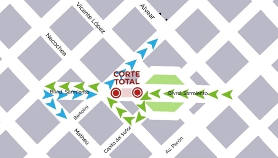 -De avenida 6 de Julio a plaza Eduardo Costa: de boulevard Sarmiento se deberá girar a la izquierda, bordear la plaza 1° de mayo (del lado del Skatepark), tomar Capilla del Señor, luego Necochea y finalmente Sarmiento.