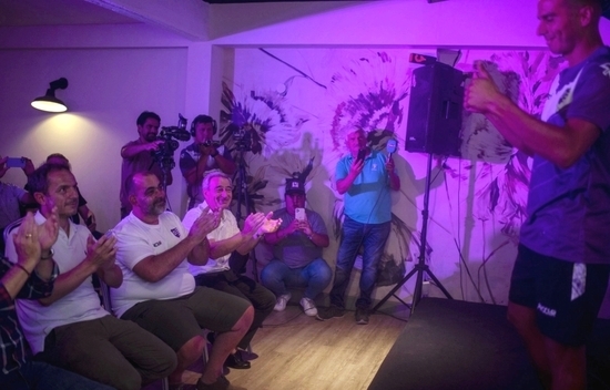 Abella junto a jugadores y dirigentes violetas tras la presentación de la nueva camiseta.