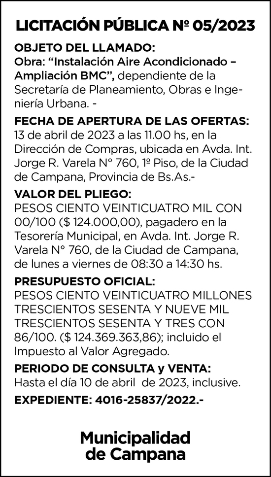 El llamado a Licitación se enmarca en el Expediente 4016-25837/2022. El valor del Pliego es Pesos ciento veinticuatro mil con 00/100, pagadero en la Tesorería Municipal, en Avda. Int. Jorge R. Varela Nº 760, de la Ciudad de Campana, de lunes a Viernes de 8:30 a 14:30 Hs. y el período de consulta y venta se extiende hasta el día 10 de abril de 2023, inclusive. La apertura de las ofertas tendrá lugar el 13 de abril de 2023 a las 11 Hs, en la Dirección de Compras, ubicada en el 1º Piso de la dependencia municipal antes mencionada.