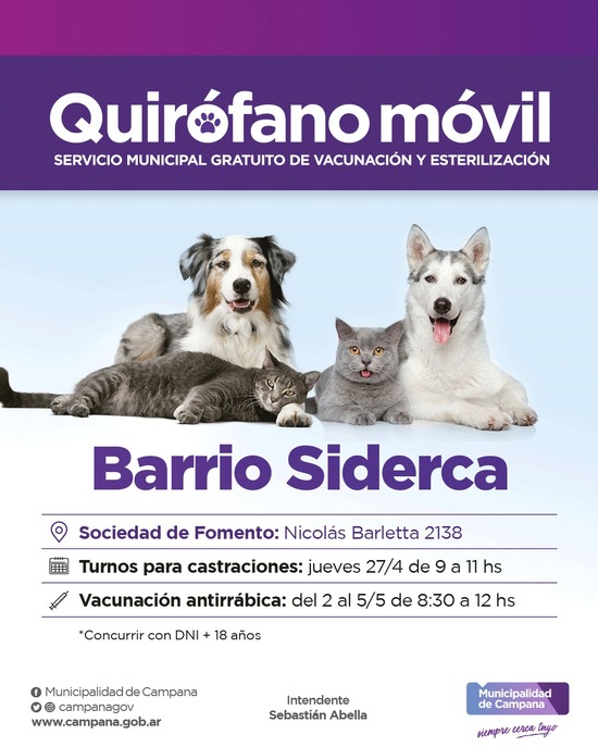 La Dirección General de Calidad Ambiental, Bromatología y Zoonosis del Municipio sigue adelante con el cronograma de visitas del quirófano móvil a los distintos barrios de la ciudad e informó que la semana próxima estará en el barrio Siderca.
