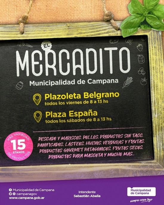Si el clima acompaña, el Mercadito de Campana, propuesta que gestiona por la Dirección de Producción de Producción del Municipio para colaborar con la economía familiar, estará este viernes 26 en la Plazoleta Belgrano y el sábado 27, en la Plaza España.