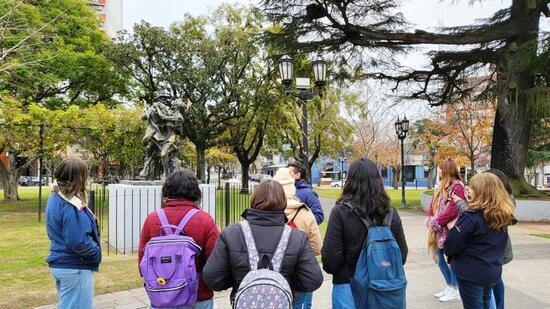 El primer contingente estuvo integrado por alumnos de la Escuela de Arte, quienes recorrieron la Plaza Eduardo Costa y conocieron detalles de su creación como también de los monumentos que allí se emplazan.