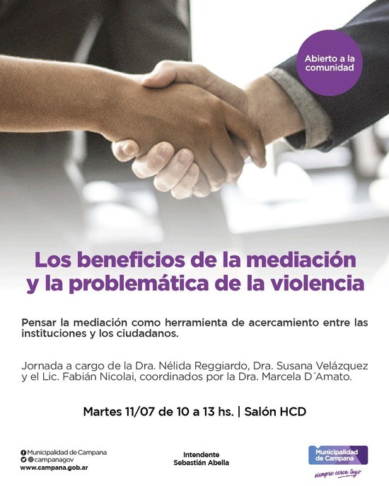 La jornada de mediación será coordinada por la Dra. Marcela D´Amato y contará con la disertación de las doctoras Velásquez y Reggiardo y el licenciado Fabián Nicolai, especialista en el área de mediación.