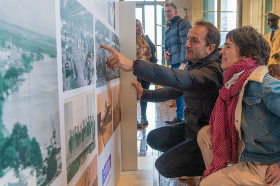 El intendente, junto a la secretaria de Salud, Cecilia Acciardi, buscando a su abuelo en una de las fotos históricas que se exhiben en el Museo Ferroviario.